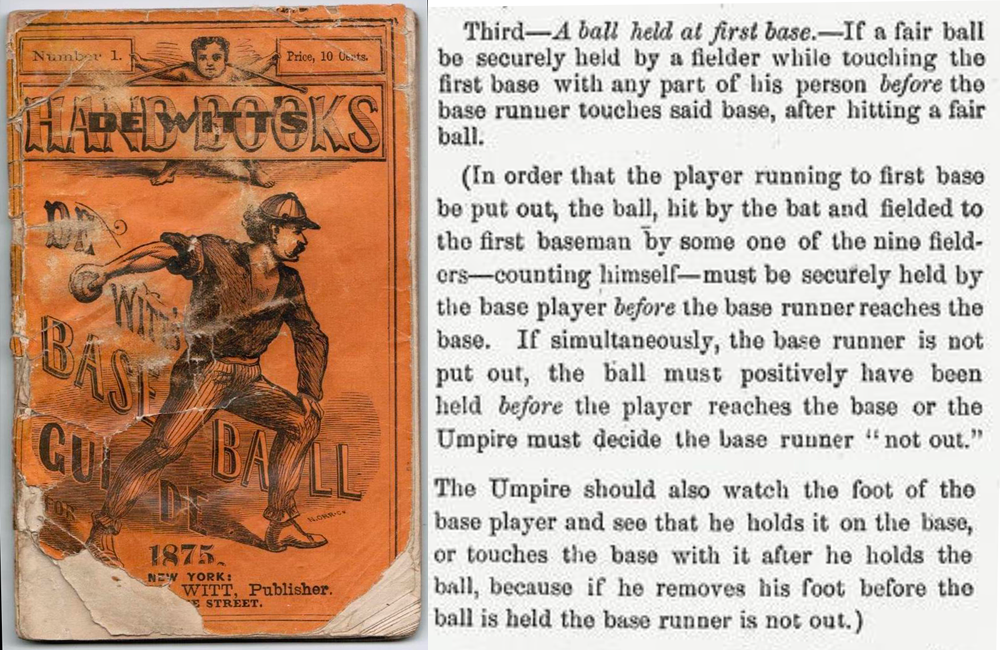 Now, a reasonable person could also argue that this is all just semantics. Maybe the writers of the rulebook just used the words “before” and “after” interchangeably, based on whatever allowed them to write each particular rule in the simplest way possible. The rulebook could have mentioned ties, but omitting them was almost certainly a choice. They make sure to spell out what happens for other edge cases, like balls hitting the foul line and the very edges of the strike zone. Baseball Almanac notes that the 1875 De Witt’s Base Ball Umpire’s Guide, edited by the legendary Henry Chadwick, made it clear that the tie went to the runner. “In order that the player running to first base be put out,” it says in a parenthetical, “the ball…must be securely held by the base player before the base runner reaches the base. If simultaneously, the base runner is not put out, the ball must positively have been held before the player reaches the base or the Umpire must decide the base runner ‘not out.’” Other contemporary sources agreed. John Thorn, MLB’s official historian, told The New York Times in 2012 that the concept was probably never codified in the rules intentionally, because “it gives the umpire something of an out, an excuse if he can call a tie.”