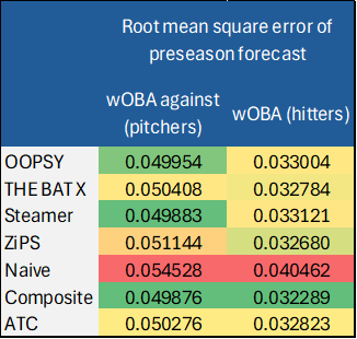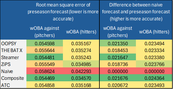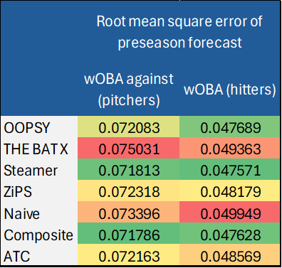 Finally, I calculated the root mean square errors (RMSE) for each statistic from each projection system. I could have also calculated the mean absolute error, but RMSE is more typical. RMSE represents the standard deviation of the residuals, a measure of the typical distance between a forecast and an actual result. I weighted the RMSE by 2025 plate appearances for bats and total batters faced for arms. Following instructions from an exchange with Tango, I also calculated the difference between each projection and a naive projection, with the naive projection assuming everyone has the same projection. To calculate the difference between a projection and a naive projection, I squared both, subtracted the smaller number from the larger number, and then took the square root.