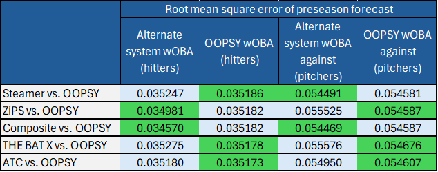 For demonstration purposes, here’s how I rescaled OOPSY’s wOBA projections. I looked at all of the 2025 major league hitters with an OOPSY projection. I took the average of their wOBA projections weighted by their actual number of plate appearances in 2025; for OOPSY, this was .316. Next, I rescaled all of the projections to assume the same .313 2025 league average wOBA. To do this rescaling for OOPSY, I subtracted .316 from each wOBA projection, then added .313. To convert ERA to wOBA against, Tango’s preferred catch-all metric for pitchers, I divided each pitcher’s ERA projection by their projection system’s league average ERA, took the square root, and then multiplied by the 2025 league average wOBA, .313.