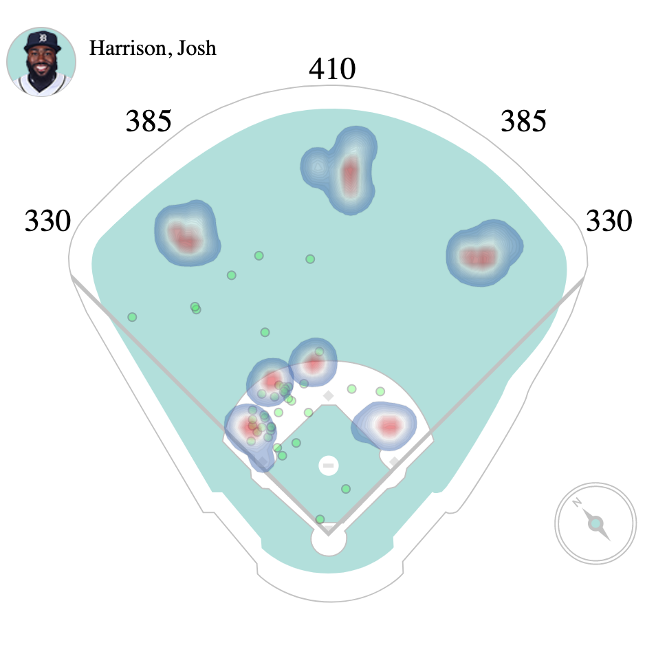 Even in a sample just shy of 150 plate appearances, an 80 point difference in wOBA and xwOBA probably isn’t just due to luck alone. Infield positioning could explain at least part of the difference, and indeed, teams shifted Harrison at a much higher rate in 2019. Harrison was shifted on over 20% of his plate appearances last season after seeing a shift less than 5% of the time in the three years prior. This defensive response was coming eventually — Harrison is in the top 20% of all hitters in Pull% over the last three years. Furthermore, he pulled the ball over 46% of the time in 2019, a career-high.