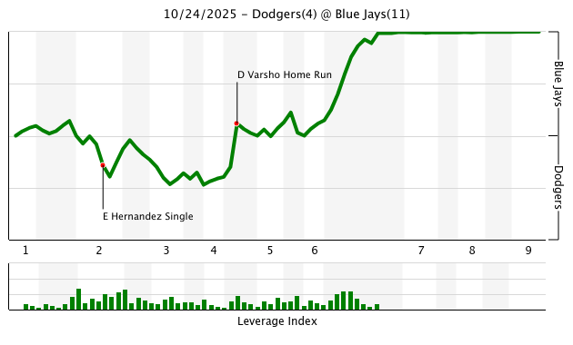 Despite the mid-game onslaught, none of the Dodgers relievers used (Sheehan, Banda, Justin Wrobleski, Will Klein) had to throw more than 16 pitches in this game. Meanwhile, Domínguez required just 13 pitches to get four outs and seems likely to be available in Game 2 if the Blue Jays need him.