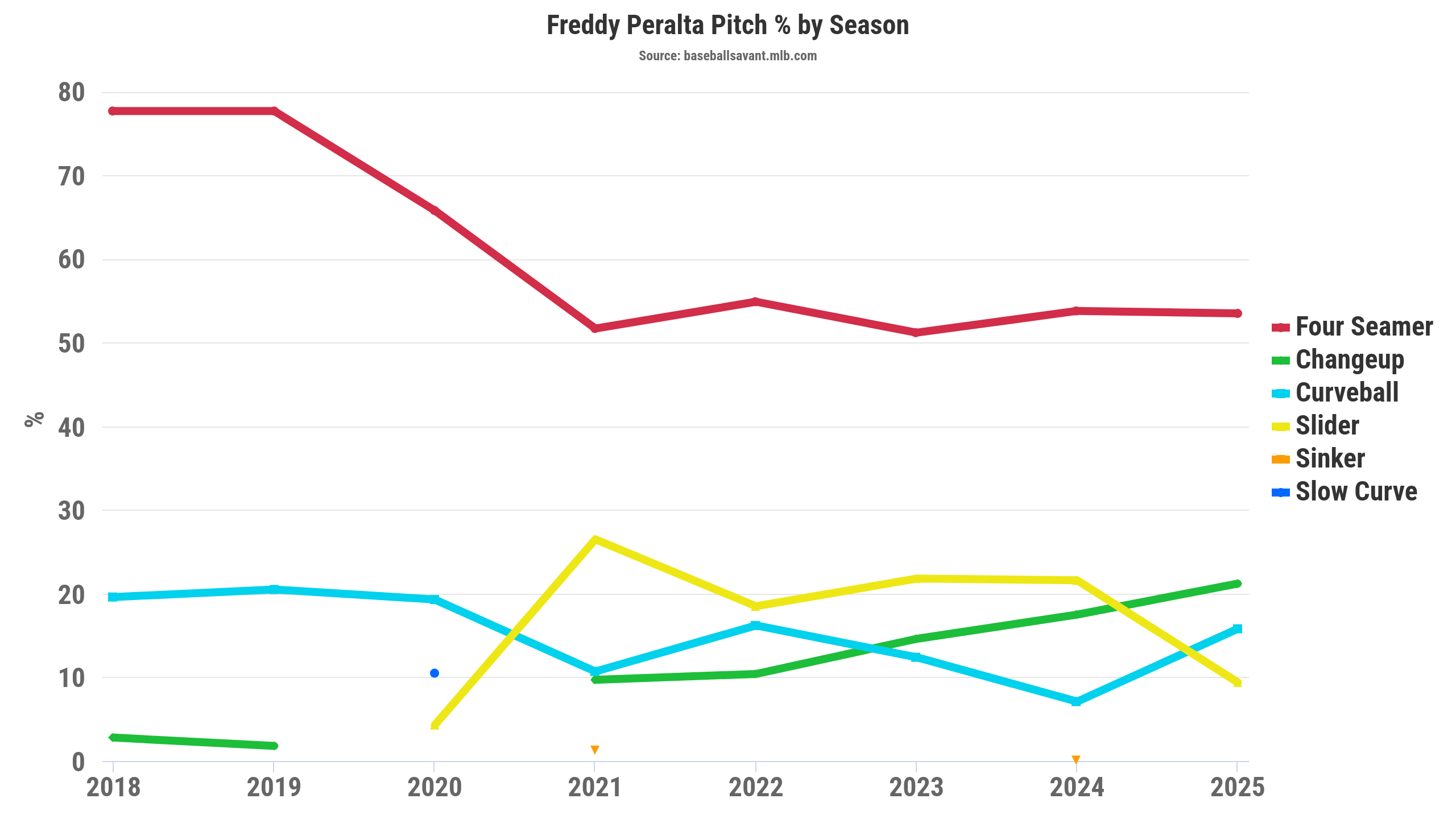 Peralta halved his slider usage in 2025, throwing it just under 10% of the time. He didn’t really throw it to lefties at all, and against righties, he threw all three of his non-fastballs roughly 16% of the time.