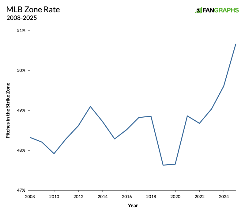Lately, the calculus has shifted somewhat. The zone rate has been rising because pitchers have been instructed to aim down the middle and trust in their stuff. In 2024, 49.6% of all pitches were in the strike zone and 26.5% were specifically in the heart zone (the area at least one baseball’s width from the edge of the zone). Both of those numbers were the highest rates we’d seen since the start of the pitch tracking era in 2008, and both of those numbers were surpassed in 2025, when for the first time ever, more pitches hit the strike zone than missed it. Across baseball, the ideal zone rate has increased.