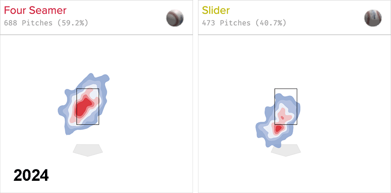 Below are heat maps of Scott’s pitches in 2024 and 2025, courtesy of Baseball Savant. Even though Scott went back to missing the zone again during the second half, the difference in his approach is plain to see.