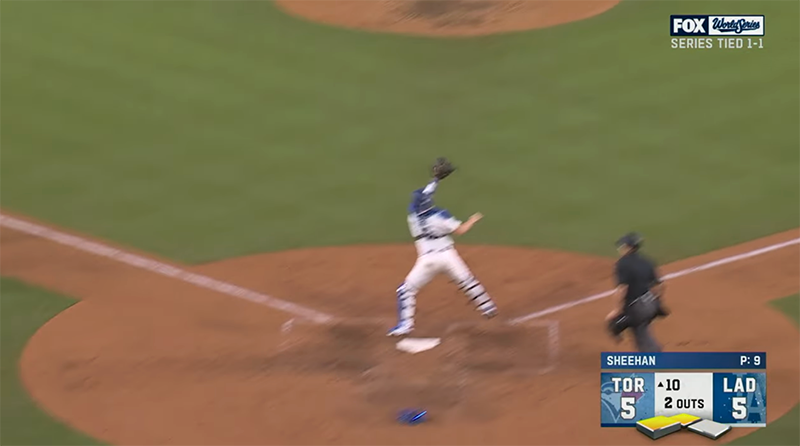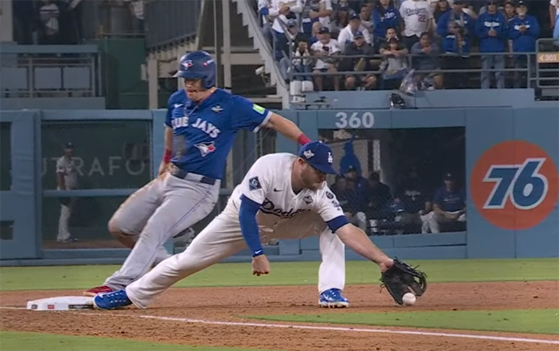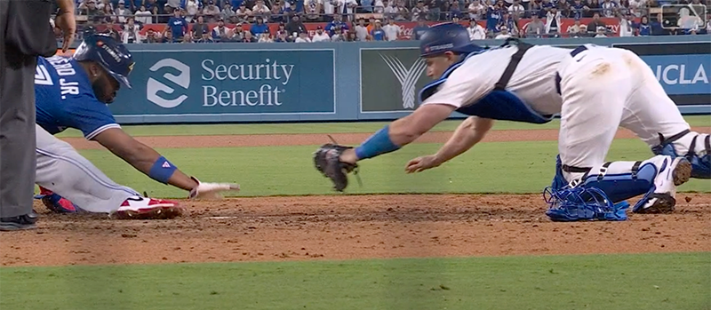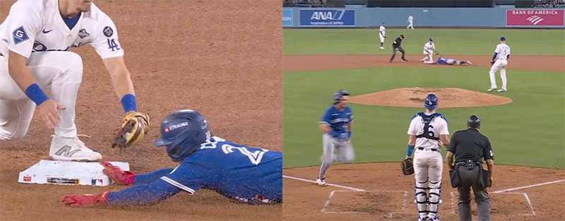 The next baserunning decision was hugely consequential. In the top of the third, Giménez came up with one out, runners on the corners, and the Blue Jays down 3-2. He hit a perfect sac fly into deep center field, and Barger tagged up to tie the game. In fact, the ball was so deep that over at first base, Ernie Clement also decided to tag up. He came about four inches from making the third out at second base. Even though Barger was aware of the situation and ran hard from third, he was still a few feet slower than Clement. Had Clement been thrown out, the run wouldn’t have scored and the Dodgers would have held onto their lead.