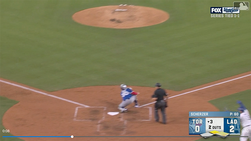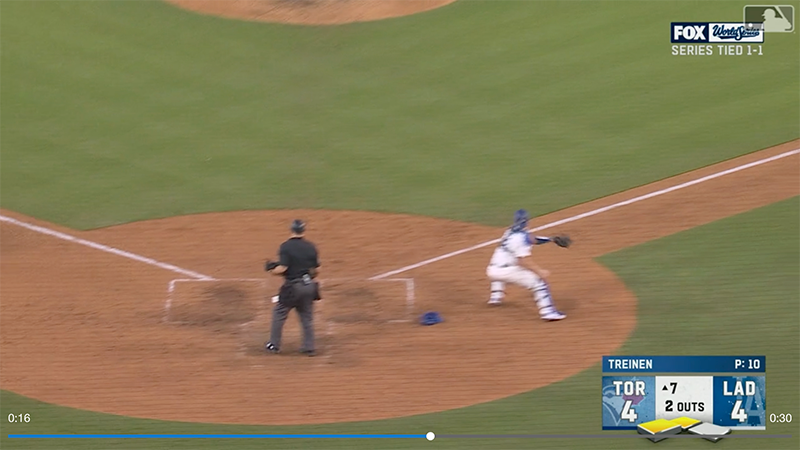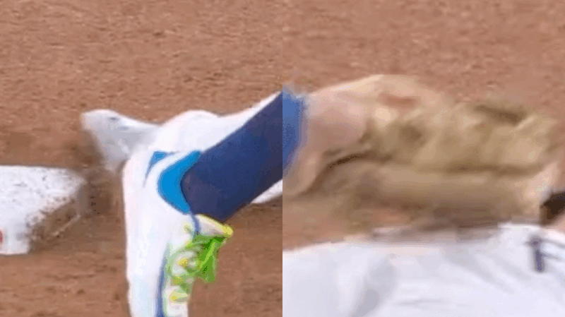 We’ll start in the bottom of the third inning, when Freddie Freeman stole second base. Or did he? He was ruled safe on the field, and the call stood after the Blue Jays challenged. I went back to the technique I used to analyze a close tag play from the ALCS, pulling a slow motion clip into iMovie, zooming in on the tag and the foot touching the base in a slow motion in a split screen to see which happened first. As is often the case, Freeman’s cleat kicked a wave of dirt in front of it, obscuring the action. The only way to tell for sure when he touched it is to watch the base flex as it absorbs the pressure from his cleat. The first thing it does is pop off the ground by just a millimeter or so, because his cleat kind of digs under it. You can see a slight shadow beneath the base. Likewise, the camera angle is a little higher than the play, so the only way to tell when Andrés Giménez got his tag down onto Freeman’s shoulder is to watch for when the web of his glove starts to bend upward. If you watch it enough times, you’ll see that the glove flexes one frame before the base rises. By the slimmest of margins, Freeman should have been called out.