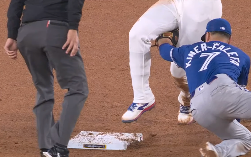 The next weird play came when the Blue Jays intentionally put the winning run on first base with one out in the bottom of the ninth, because the winning run came in the form of Shohei Ohtani. Ohtani got a huge jump and stole second, but only for a millisecond. An absolutely perfect throw from Kirk forced Ohtani to charge into the bag, and he executed a pop-up slide that featured way too much pop. Ohtani bounced up and off the bag, and Kiner-Falefa’s insistent, inconveniently placed tag caught him in midair.