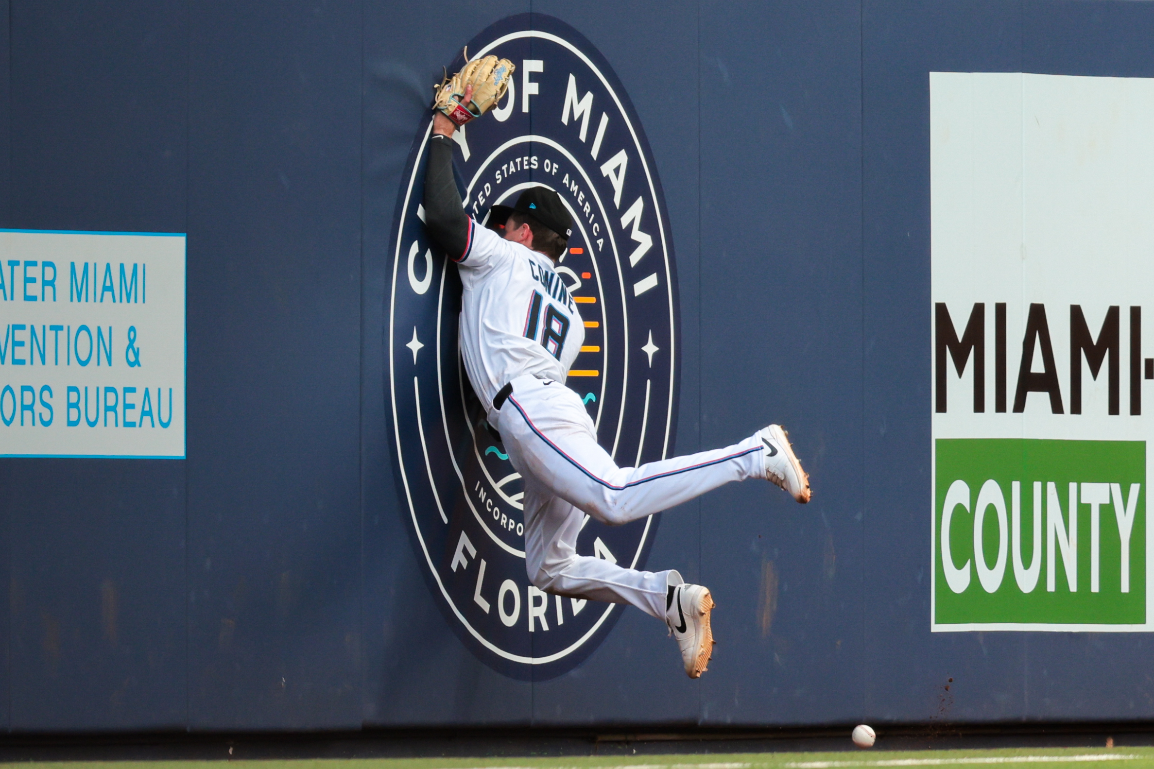 This is Griffin Conine seemingly trying to use the seal of the city of Miami as some sort of teleportation portal. Or maybe he’s trying to hold onto it for dear life while a tornado does its best to yank him into the sky. Under different circumstances, this play might be the highest-ranked on the entire list, but this was actually a foul ball and Conine was running into the side wall. That in itself wouldn’t necessarily be disqualifying. We here at FanGraphs support players running (safely) into any and all manner of walls. Unfortunately (for both Conine and his face), the side wall wasn’t nearly as well padded as the regular wall. No player tried quite as hard to merge with the wall as Conine. I mean, you have to imagine that this is what it would look like if you tried to make out with a wall. But the lack of padding means no ripples. No wrinkles. Conine had his face fully smashed against the wall, but didn’t even make a dent. That’s the important distinction between smashing into the wall and smushing into the wall. No player in this entire article made harder contact with the wall or sank into it less deeply. Conine was all smash, no smush.