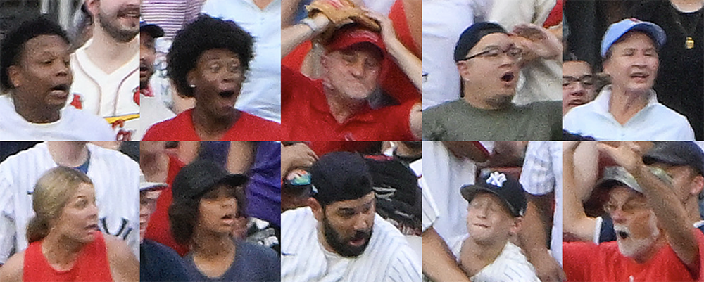 Look at all the fans in the stands. I could write an entire article about the 18 faces in the bleachers here. Some are dumbstruck. Some are terrified. They’re leaning away. They’re hiding behind one another. One person is grimacing so hard that her chin seems to have gotten wedged somewhere behind her esophagus. Another is ducking and covering like she thinks the ball is a nuclear bomb. And then all the way to the right, there’s a little girl who has just wandered down the stairs and into the frame carrying a soda that’s approximately the same size as her entire torso.