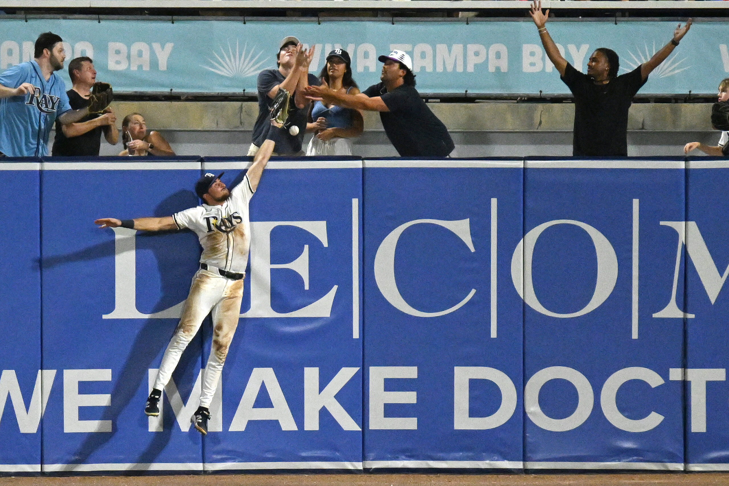 That’s Josh Lowe trying and failing to rob Julio Rodríguez of a home run in September. It was a great effort. Not only did he get way above the wall, he was almost perfectly parallel to it. The dirty uniform and stark shadow really bring some character to the shot. Look at the trio right above him, their eyes all converging on a spot a foot or two above their heads even though the ball had already trickled through their fingers. However, Lowe was too parallel to the wall. He didn’t crash into it at all. He barely even touched it. The only disturbances you’ll see in the wall are the many places where the fabric has gathered because it’s just kind of ill-fitting and saggy. We award Lowe no points for the general jankiness of a minor league ballpark. Now that we know what we’re looking for, let’s start with the honorable mentions.