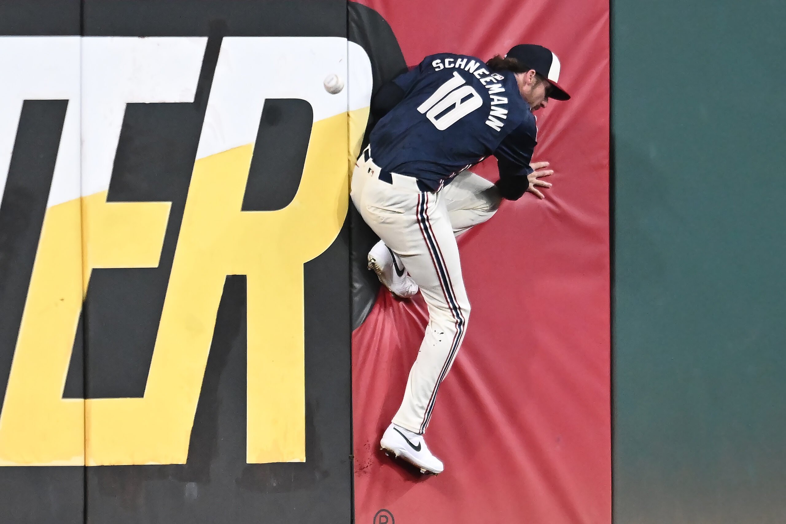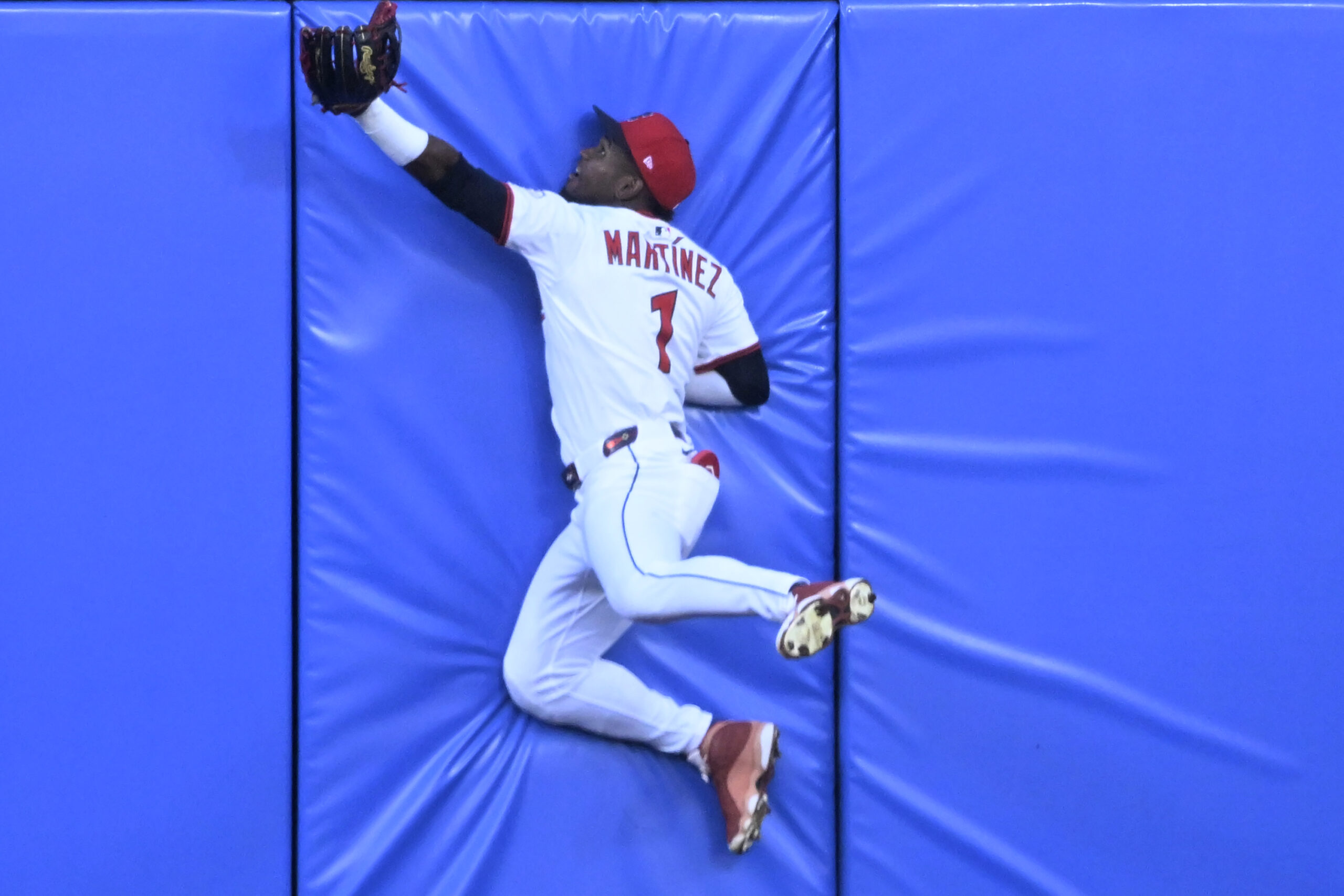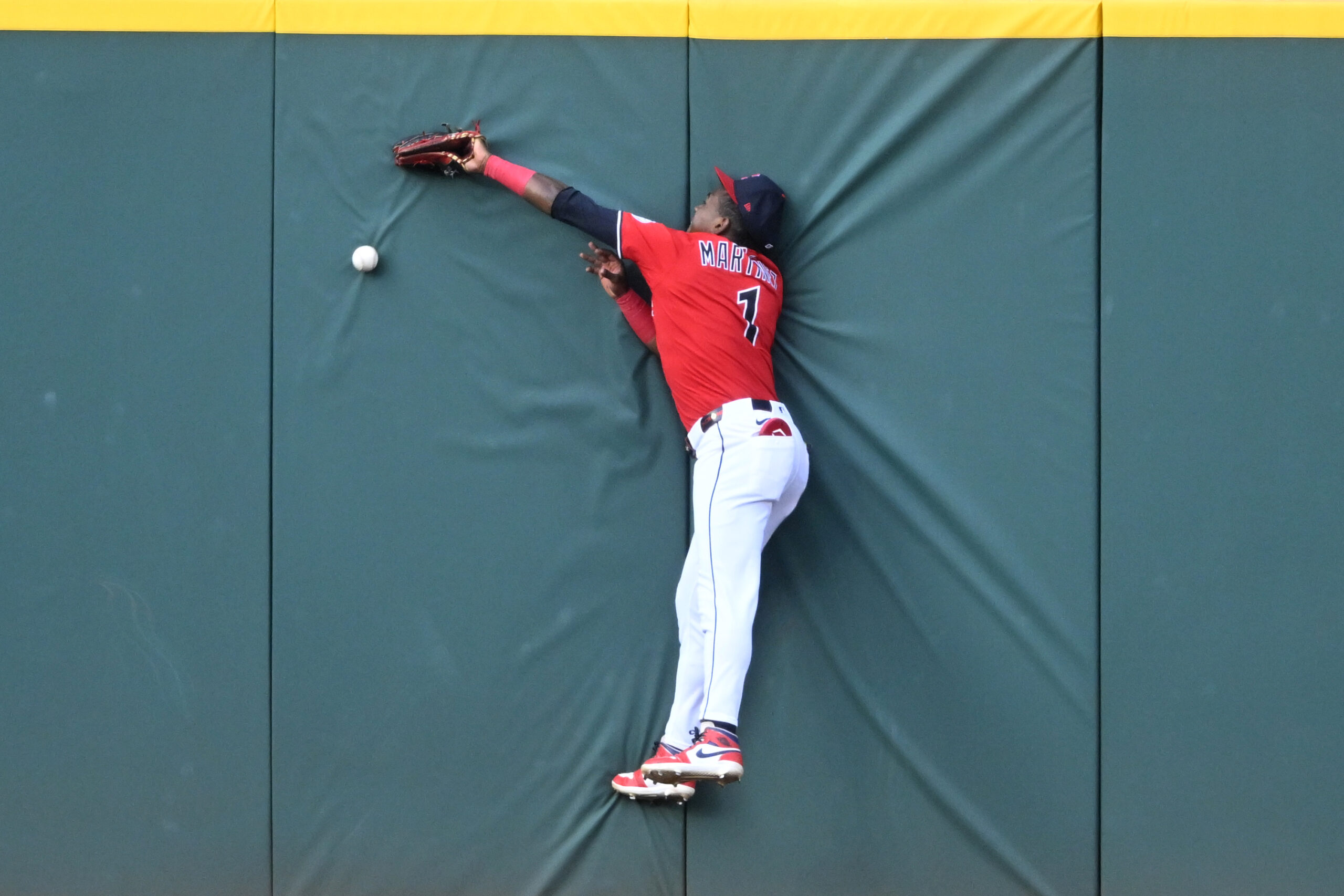 More than any other in this article, this picture really tells the whole story. You can almost hear the splat from Angel Martínez flopping into the wall like a pancake being flipped from a great height. The big ripples radiate from the spot where his torso crashed into the wall, then the smaller disturbances come from where his cleat took purchase, where his glove landed after the ball glanced off it, and where, finally, the ball itself smashed into the wall. A moment later, the ball caromed 30 feet to the left, where Steven Kwan picked it up and fired it in toward the infield. The play ultimately went down as a double. Martínez gets extra points for looking like he’s wishing for nothing more than to be safe inside the wall, laughing at us fools stuck on the outside.