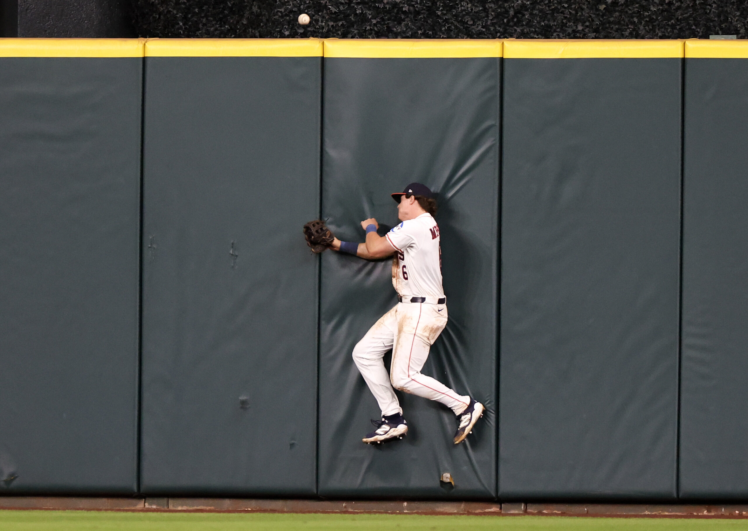 This is Ramón Laureano. Sorry, I meant to say this is Ramón Laureano’s butt. (It’s also named Ramón Laureano.) This ball was a home run off the bat of Jeremiah Jackson. Laureano didn’t even end up making an attempt to catch it. It landed about 15 feet deep and 30 feet off to his left. But he did climb up the wall, and I cannot even describe to you how easy he made it look. He made it look so easy even though it is not easy. If it were easy, people would do it all the time. They do not do it all the time. Because it is hard. Climbing up the wall is only easy for Ramón Laureano. He squeaks onto our list here because although he didn’t run directly into the wall, he did climb up it with so much force that he left a big claw mark in the middle of the fence, with ripples all around it. I take it back, Schneeman isn’t Spider-Man; Laureano is. Now we move onto the main event.