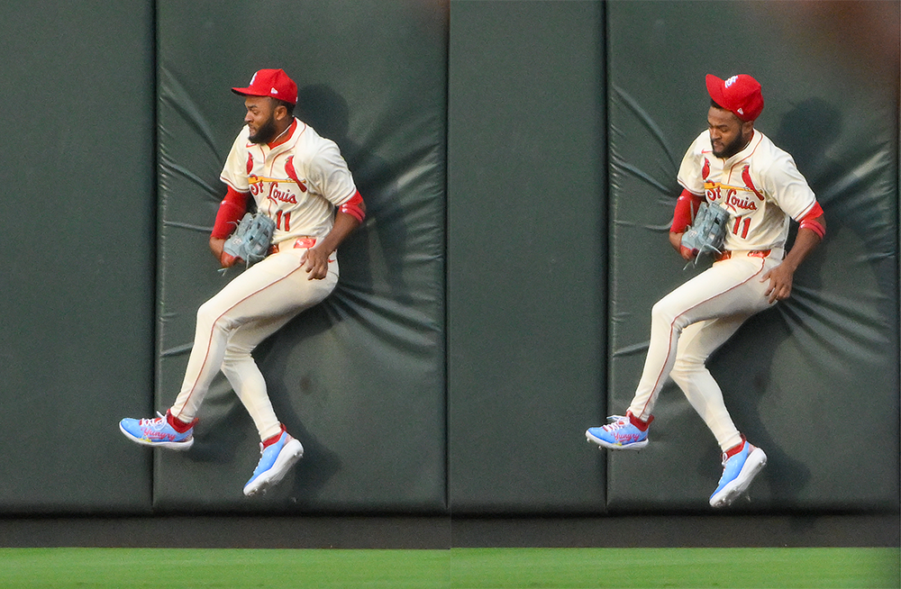 The top indicator of smush is the wrinkles in the synthetic skin of the wall as the impact ripples outward and the foam buckles to accommodate you. The perfect wall smush finds an outfielder smushed flat against the wall, glove arm extended above them, face sticking out to the side with the eyes agog, and big, glorious ripples heading out in every direction like a toddler’s drawing of the sun. That’s what we’re looking for most of all. Here’s an example: