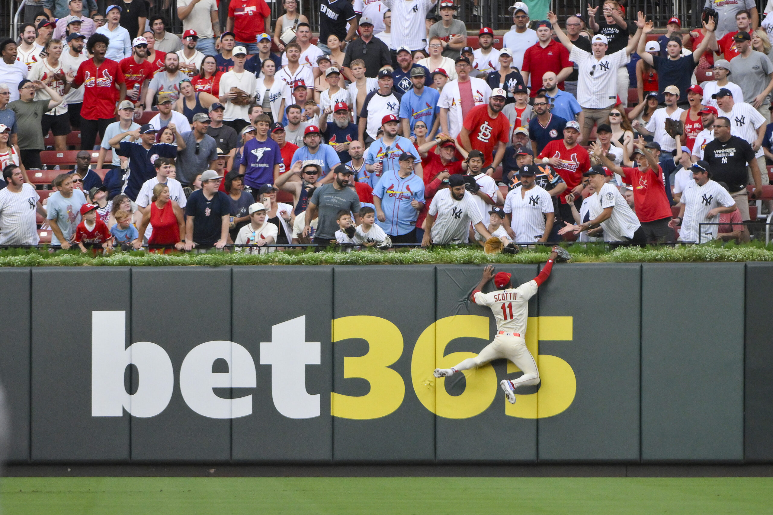 Look, I don’t even know how to grade what Victor Scott II did against the Yankees on August 16. As incredible as this picture is, it doesn’t nearly do justice to Scott’s attempt to rob an Aaron Judge home run here. This ball was in the right-center gap, and Scott came screaming over from center and leapt at nearly full speed into the wall at an oblique angle. The ball just grazed the tip of his glove, and then he slammed into the wall and his momentum sent him rolling sideways across it in the air. The ball bounced hard off the top of the fence, which is why you can see it five feet above Scott’s outstretched arm. This picture is short on ripples because it comes after the main impact, but it does show the spot where Scott’s cleats tore up the gambling sign. More importantly, let’s enjoy some of the faces in the crowd reacting to what Scott just did.