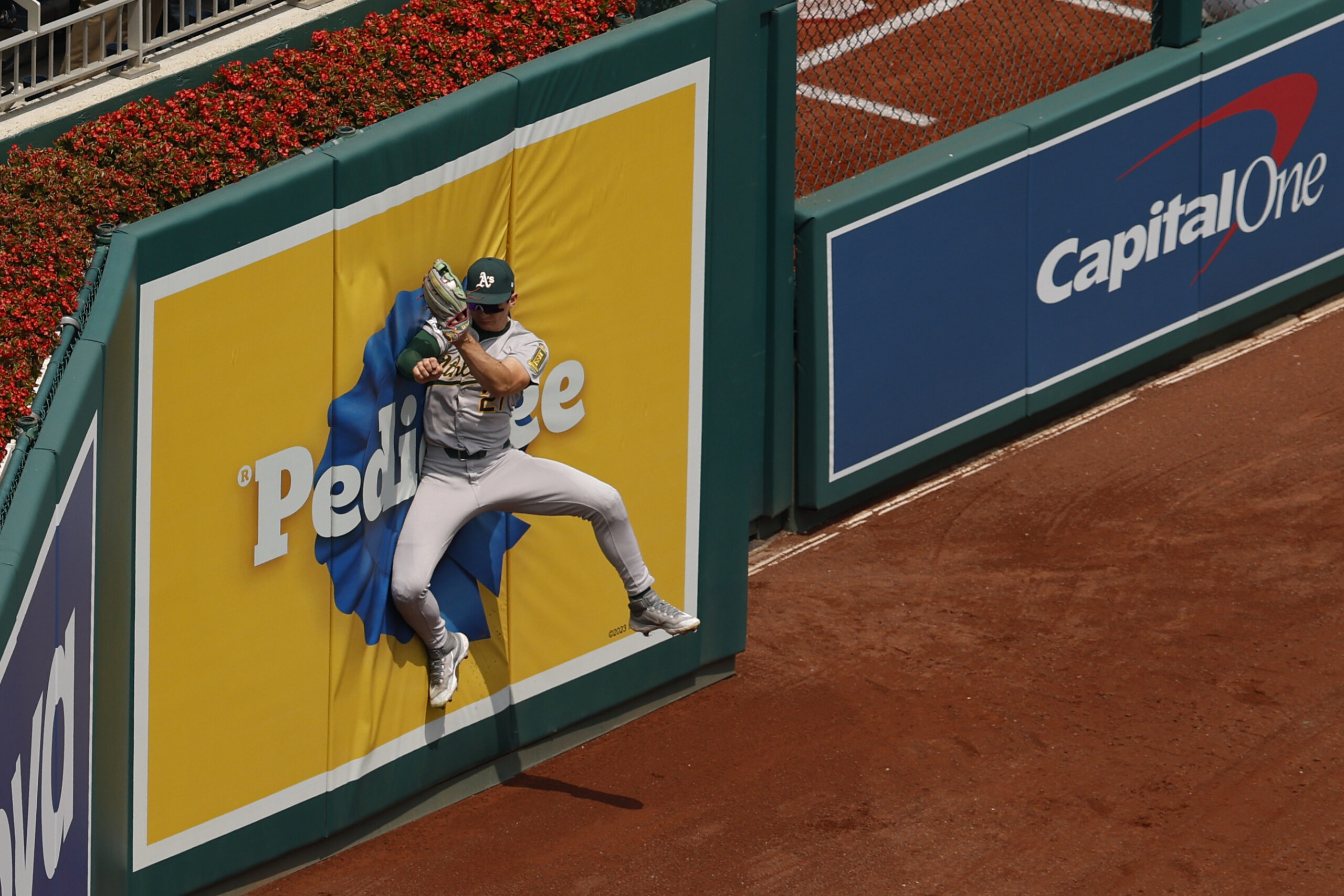 Next up is Tyler Soderstrom, who gets major points both for ferocity and pinpoint accuracy. Soderstrom smashed into the wall to rob Paul DeJong of extra bases and centered himself perfectly in the blue ribbon on the pedigree sign. More importantly, look how deep into that sign he got. He looks like he might get stuck there. He looks like he might bust straight through it. Nationals Park may never recover.