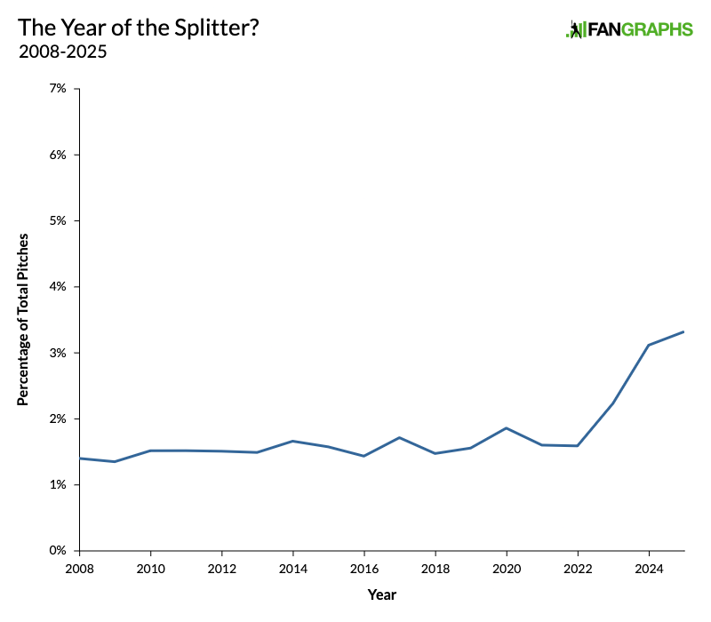 The year of the splitter has come and gone. Actually, those of us who follow these things closely know that both 2023 and 2024 were considered the years of the splitter, and then we established back in March that 2025 would be the year of the kick change. While major league pitchers ran a 3.3% splitter rate in 2025, the highest mark since the pitch tracking era started in 2008, that represented a jump of just 0.21 percentage points from 2024. It’s a difference of less than one splitter per team every three games. While the number is still going up, the big increases came in 2023 and 2024, and the pace fell off this year.