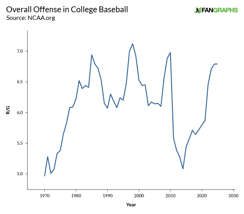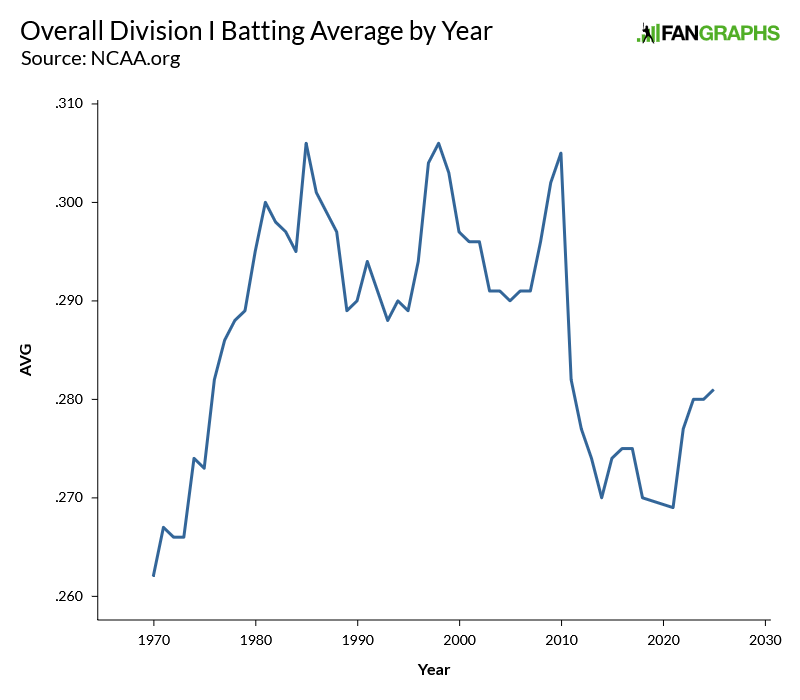 College baseball is a pretty wild offensive environment right now, even by its own standards. See, unlike MLB, the NCAA is pretty open to putting its thumb on the scale to influence the competitive environment. Metal bats came in in 1974, then bat standards were changed in 1999 and again in 2011 to counteract increasingly home run-happy offensive environment: