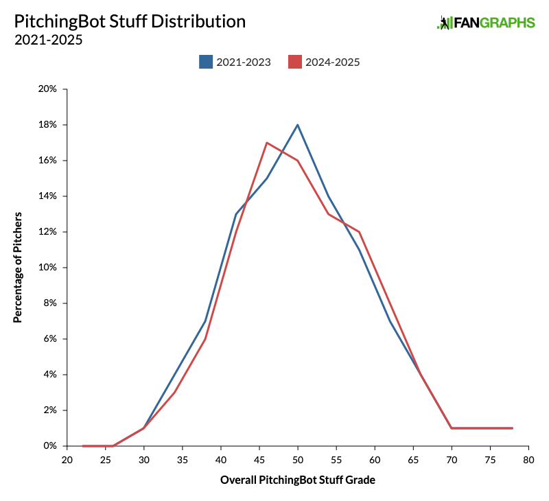 From 2021 to 2023, 46% of pitchers graded out between 94 and 106. In 2024 and 2025, that number increased to 49%. That provides the narrowness we expected, and you can see that it comes specifically from the back end of the distribution. From 2021 to 2023, 12% of pitchers featured stuff grades below 90. That fell to 9% in 2024 and 2025, and that decrease very much showed up in the PitchingBot distribution.
