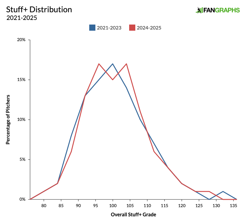 That’s small enough that it’s tough to see the effects in a distribution plot. To help make that clear, I’ve split the distributions into two sets, 2021 to 2023 and then 2024 and 2025. Here’s Stuff+. I took every pitcher-season on our list, and split their overall Stuff+ grade into buckets of four points.