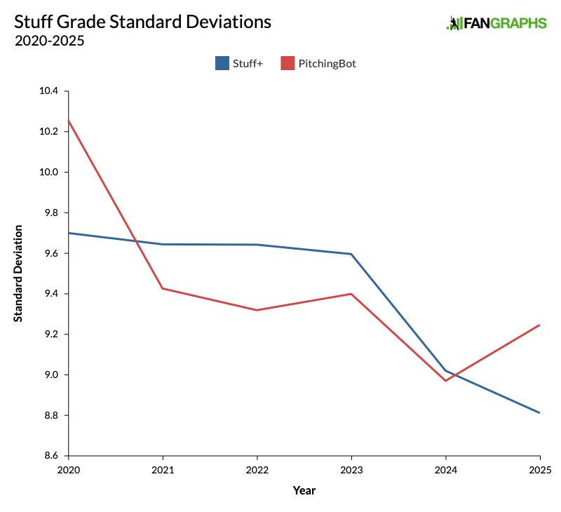 Even if you throw out the scrawny 2020 sample, the standard deviations of both Stuff+ and PitchingBot have clearly been trending downward over the past four years. From 2020 to 2023, the standard deviation of Stuff+ was nearly unchanged: 9.7 in 2020 and 9.6 in each season from 2021 to 2023. It started falling in 2024 and reached 8.8 in 2025. This is a small effect; we’re talking about fractions of a point. However, it might feel larger when you realize that it’s a decrease of nearly 9%.