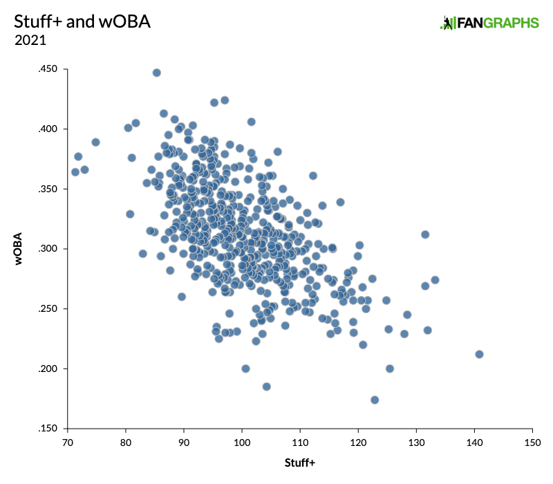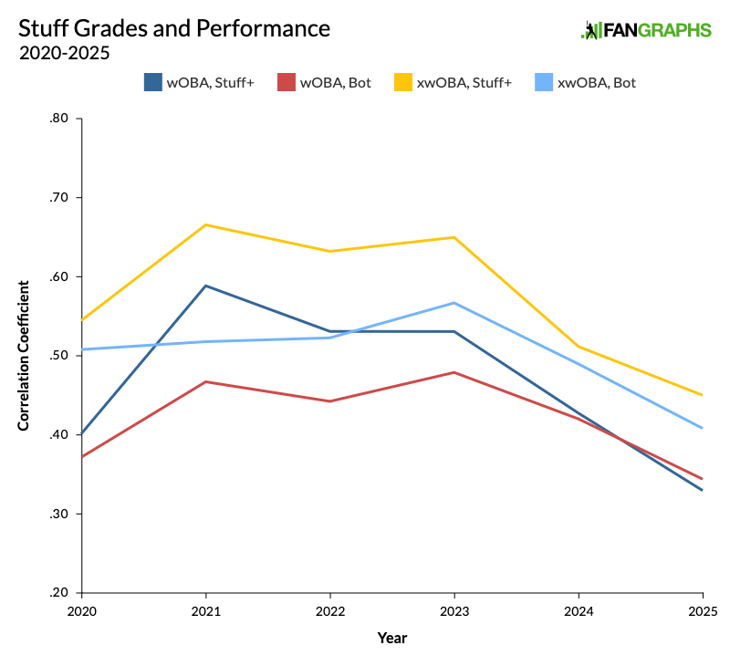 Before I leave you, I need to remind you that nothing I’ve written here today means that stuff (or even stuff grades) matters less than it used to. If we separate stuff, the platonic ideal of pitches that are hard to hit, from stuff grades, which just show our best approximation of that ideal, the former is never, ever going to matter less. It is pitching. Pitchers are nastier than ever, and as the distribution graphs showed, the minimum acceptable stuff level has never been higher, even if you’re just comparing it to the league-average stuff level, which is rising because, again, pitchers are definitely nastier than ever. But all that parity – along with any other distortions that result from everybody chasing measurable stuff (at least to some extent) for stuff’s own sake – means that stuff grades have never been less predictive of actual, on-field results. We’re still very early in the lifetime of these metrics. They will surely improve in the coming years, and they’ll also have to change to keep up with whatever new trends emerge from the always-evolving cat-and-mouse game between pitchers and hitters. Whether their applicability to on-field performance ever goes back to its previous heights, however, is an open question.