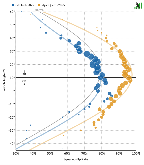 Again, it’s an “interesting” profile. Like Quero, Teel doesn’t swing particularly hard, but unlike Quero, he doesn’t swing accurately, rarely squaring up the ball and whiffing often. His carrying contact trait is a near-flawless launch angle distribution, posting a 47.8% sweet-spot rate in 2025, a mark that would have led the league had he qualified.