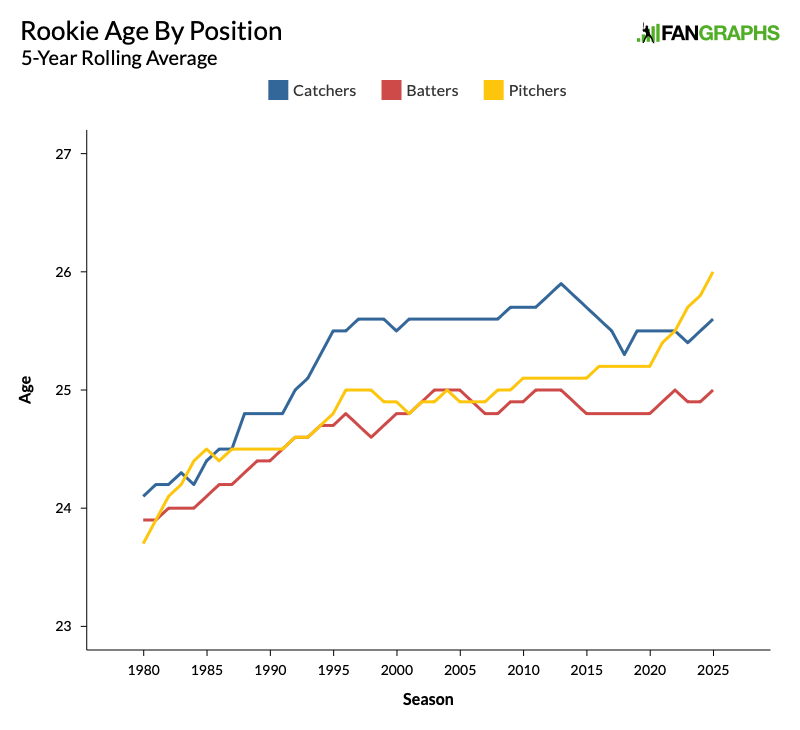 Catchers take awhile to develop through the minors. Not only must they learn how to hit pitches, they also must learn how to frame pitches, block pitches, and call pitches for dozens of their teammates. And because catching is a physically demanding job that requires more days off (unless you’re Cal Raleigh), they develop these skills a touch slower than their peers. Analysis from 2012 shows catchers tend to peak two years later than players at other positions. Teams have responded by delaying their debut: