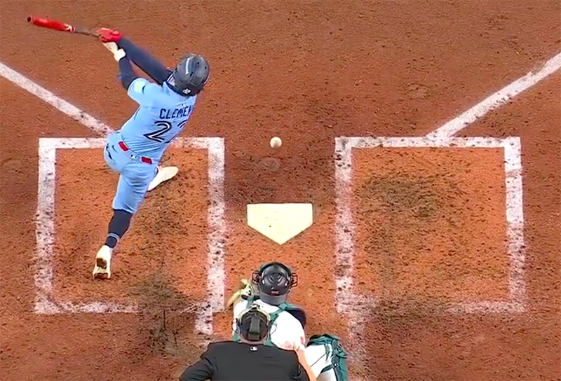 Clement found himself way ahead of a first-pitch splitter, but true to form, he managed to hold himself back for long enough to make contact. He reached out and just got the top of the ball with the very end of his bat. The ball glanced straight down into the dirt, leaving a huge impact crater and picking up a huge amount of dirt. It stayed right there, just a few inches in front of home plate. Raleigh pounced on it, and since his knee was already on the plate for the force out, he just stood up and fired to first to complete an inning-ending double play.