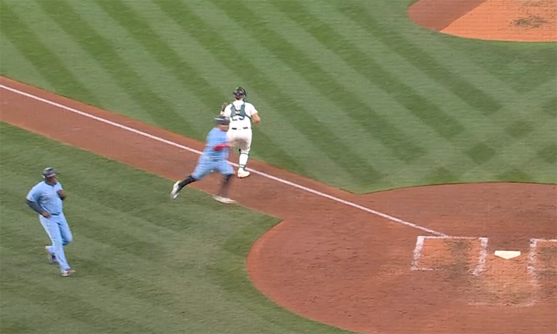 The crowd roared as flames shot into the sky from either side of the bullpen door and Woo jogged in to pitch the sixth inning. The greeting the Blue Jays gave him was much colder. Alejandro Kirk jumped on Woo’s first pitch, lining it into the right field gap for a double. It was the fourth inning in a row that the Blue Jays had led off with a hit. With one out, Clement singled into right field, and Kirk – the 11th-slowest baserunner in the game, who hadn’t scored from second on a single all season – showed no hesitation whatsoever. It was a risky send, but third base coach Carlos Febles had clearly done his homework. A good throw would have had Kirk, but Dominic Canzone’s heave came in a solid 20 feet up the third baseline. Kirk barrelled past Raleigh at the same moment that ball came in. He scored easily, and Febles ran down the baseline with him. The Blue Jays had a 2-1 lead.