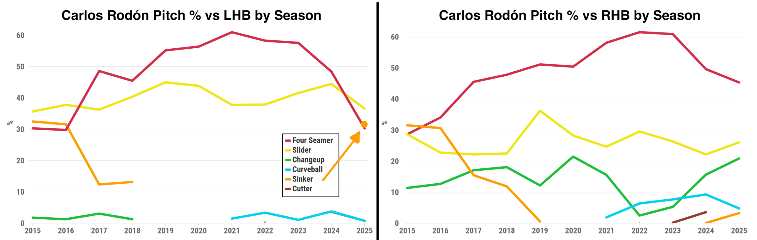 That latter mark coincides with Rodón’s vastly improved groundball rate. His 9.6-point jump from 2024 (33.8%) to ’25 (43.5%) ranked third in the majors among pitchers with at least 50 innings in both seasons, behind Griffin Canning (10.2%) and Tanner Bibee (10.1%). That jump owes something to Rodón’s reconfigured repertoire. This year, he regularly used a sinker for the first time since 2018, throwing it 31.3% of the time against lefties, who hit just .119 and slugged .143 against it, while whiffing on 31.9% of their swings, though just 3.2% of the time against righties, who hit .364 and slugged .409 against it, albeit in just 23 plate appearances.