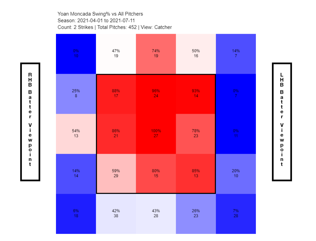 Below is Moncada’s 2020 heat map showing his swing percentage in two-strike counts: