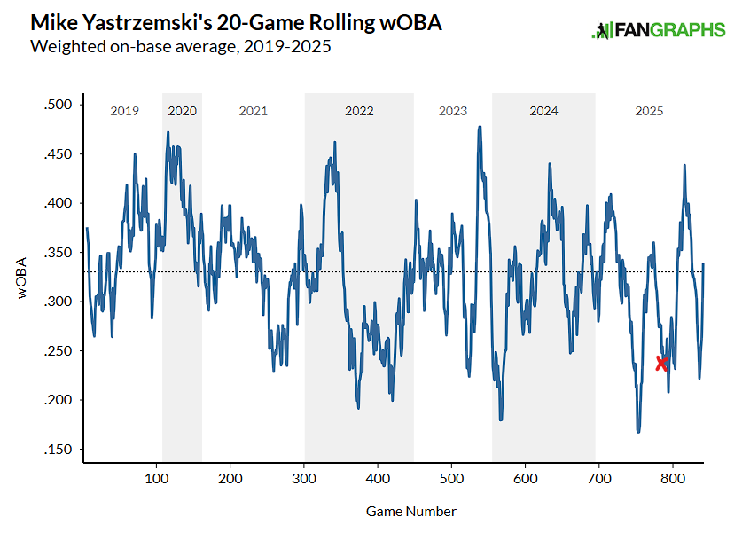 That version of Yastrzemski would command a pretty penny in free agency, even at age 35. But that’s not really how baseball works. Players get that hot all the time. It’s a game of streaks. He has reached those lofty highs at least briefly in every season he has played in. The reason that his Royals production looks so good is that he got traded to them roughly where the red X is on this chart: